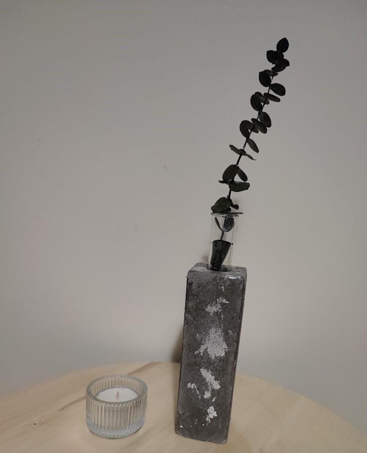 Un objeto ideal para ti sería este jarrón en cemento gris decorado con trocitos de papel de plata de líneas geométricas.